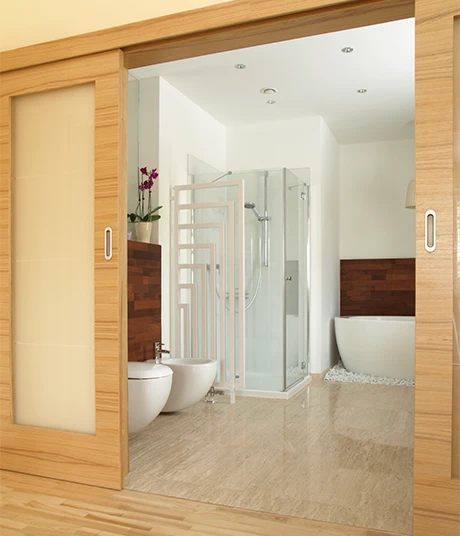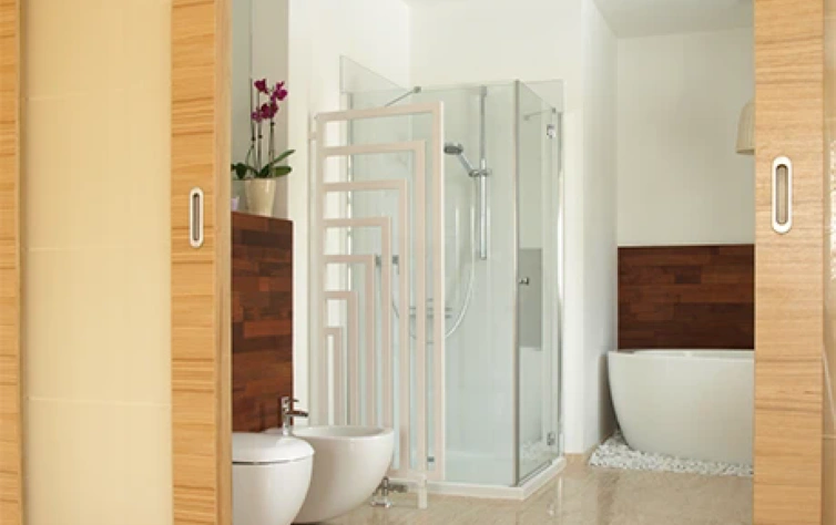 Essas portas podem ser uma estratégia inteligente de economizar espaço, além de garantir um charme extra para a sua parede da sala de estar, pois os modelos de madeira dão uma quebra no concreto da parede.