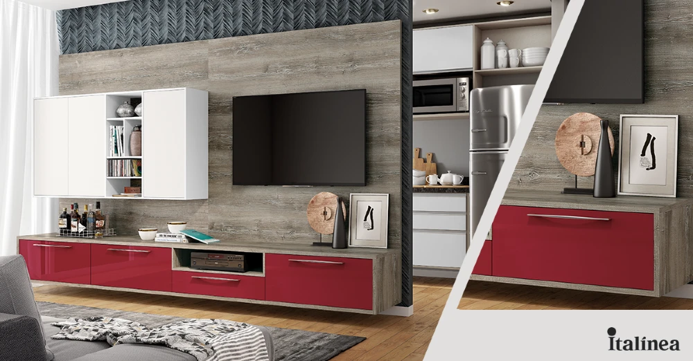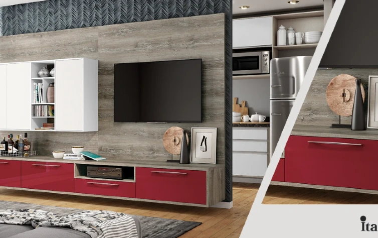 Organizar a sala com gavetões fica muito mais fácil! Além desse home theater ter espaço suficiente para você guardar aqueles itens que não quer perdidos pela casa, também deixar exposto seus livros favoritos nas prateleiras. Além disso, esse móvel pode ser o destaque do seu projeto, já que a cor funciona como contraste em ambientes cleans ou industriais.