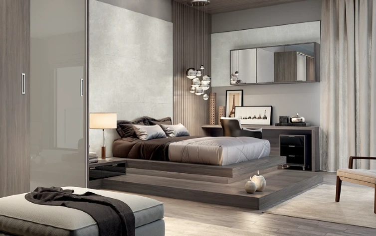 Essas camas de chão, que possuem um degrau na base, é característico em dormitórios modernos. E você pode aproveitar o espaço do degrau para colocar objetos, como vasos ou mesmo uma iluminação acoplada. Dessa forma, o degrau, além de ser o apoio da cama, também funciona como uma estante para você deixar exposto algo que goste.