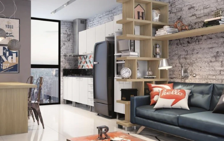 Quem mora em apartamentos pequenos, por exemplo, pode investir em ambientes duplos. Embora isso pareça um desafio, com a ajuda de um divisor, tudo fica mais fácil. Este exemplo de biombo fixo é uma ótima opção: além de cumprir o papel principal, de separar a cozinha da sala, também ajuda a encorpar o decór pelas divisórias que possui. É só você apostar em pequenos objetos, seus livros favoritos e pronto! Você tem um planejado que funciona como estante decorada e divisor de ambientes.
