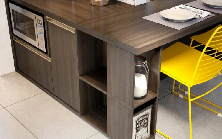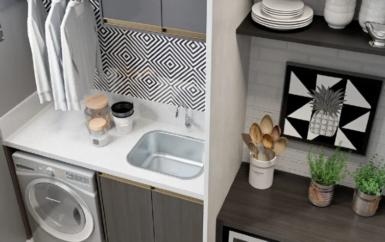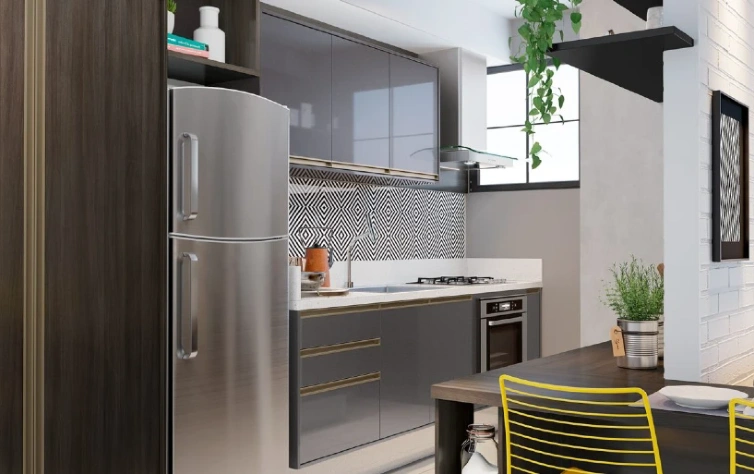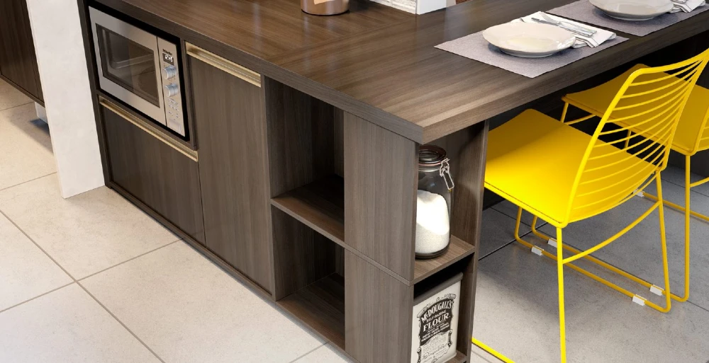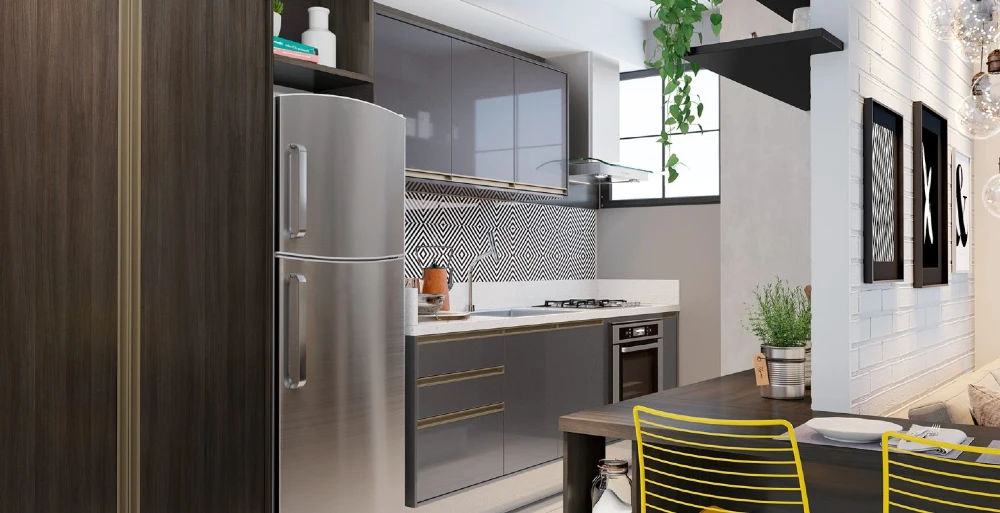 A mobília têm grande influência deste estilo. Pode seguir o padrão industrial, com tons mais fechados e estruturas metálicas à mostra, como as nossas prateleiras da  linha Nero, semelhantes a serralheria. Tons neutros e texturas também marcam presença – um exemplo, são as frentes desse armário aéreo que possui frentes do padrão Eros, com textura semelhante a mármore.