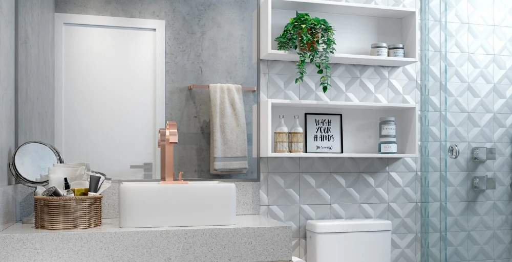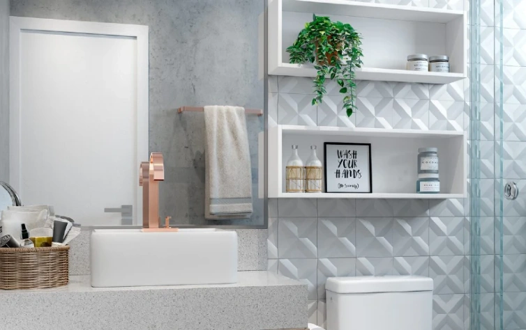 Assim como as prateleiras convencionais, os nichos servem para depositar alguns itens da sua decoração – e são uma ótima dica para preencher paredes vazias. De forma singular, você pode fazer como o exemplo abaixo e apostar em nichos com formatos diferentes: em seu interior, coloque objetos que representem você, como livros, plantas e itens menores. Neste projeto da Italínea, foram utilizados alguns nichos para contribuir com a decoração do banheiro.