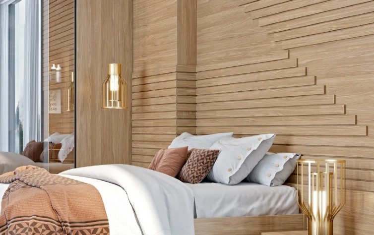 Em paredes muito grandes, utilizar quadros nem sempre é a solução mais adequada – até porque acabam não resolvendo o problema dos moradores. Um truque utilizado por decoradores e arquitetos é utilização de detalhes na parede – no exemplo abaixo, projeto da Italínea, foi utilizado um painel com detalhes ripados de madeira. Você também pode usar aplicações de papel de parede, revestimentos em 3D ou adesivos.