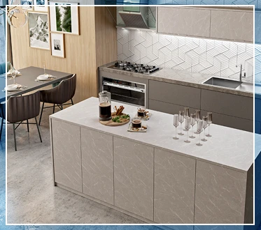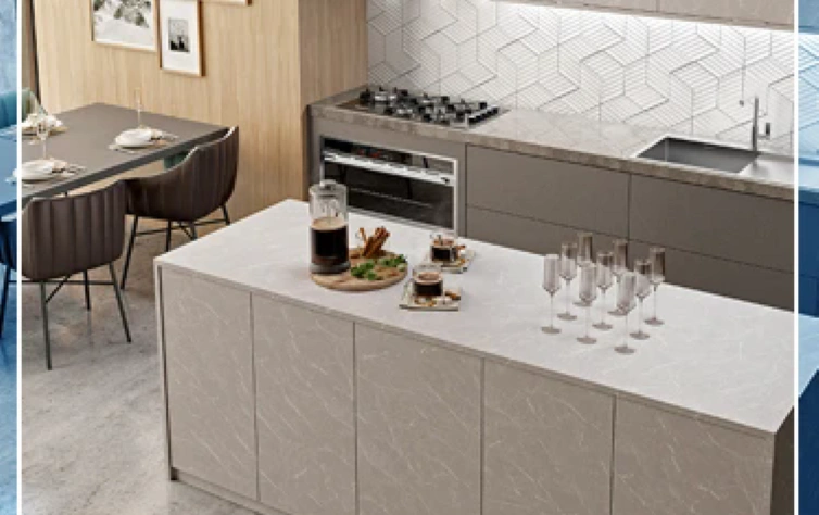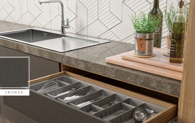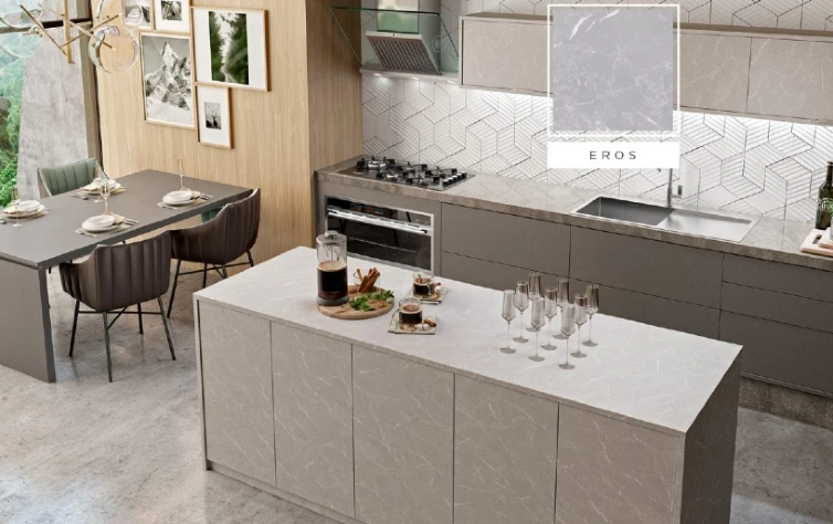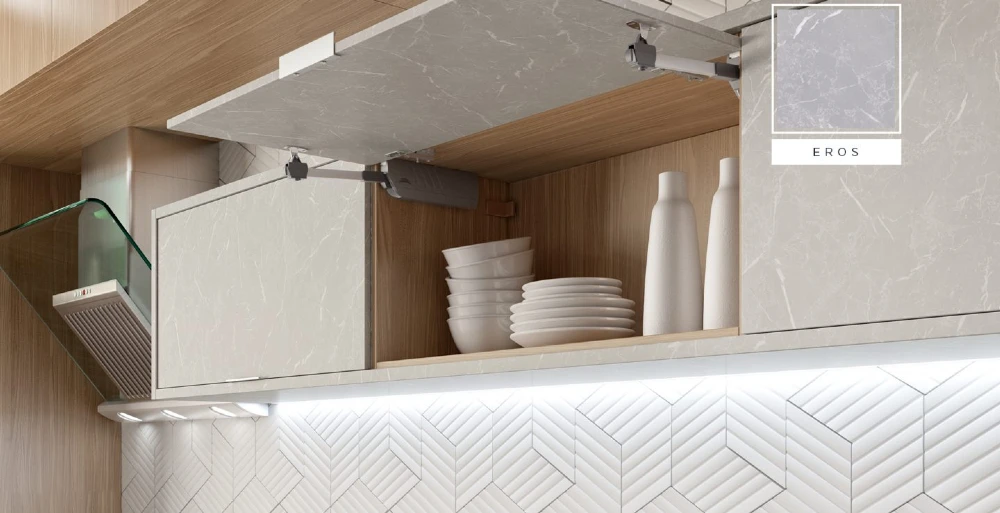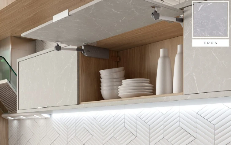 Quer um exemplo? Quando combinados o Eros com o Fendi, o Nebbia e o Gris – padrões de tonalidades mais claras -, o ambiente fica mais clássico e elegante. Outra possibilidade é combinar o Eros com o próprio Cronos e o Field, deixando o ambiente mais contemporâneo. O contraste da pedra com a madeira é equilibrado pela tonalidade neutra do Cronos que, neste contexto, vemos aplicado na cozinha mesmo sendo inspirado em tecido.