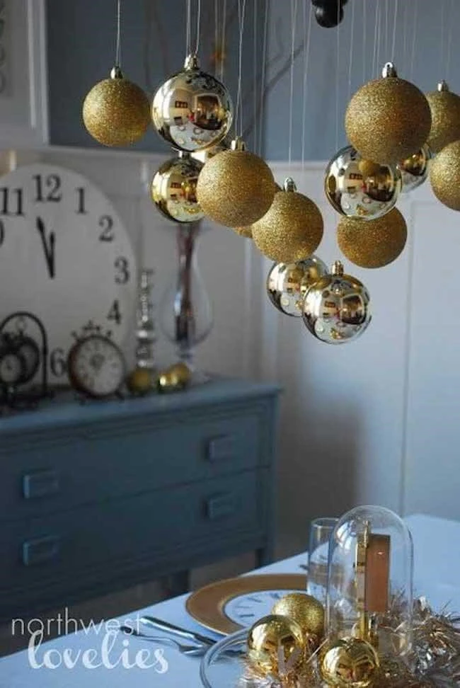 As bolinhas de natal douradas e prateadas vão dar um ar mágico à sua festa de ano novo. Pegue pedaços de nylon e amarre cada uma delas, depois pendure acima da mesa principal, onde a ceia será servida. Um toque lindo e bem simples de fazer!
