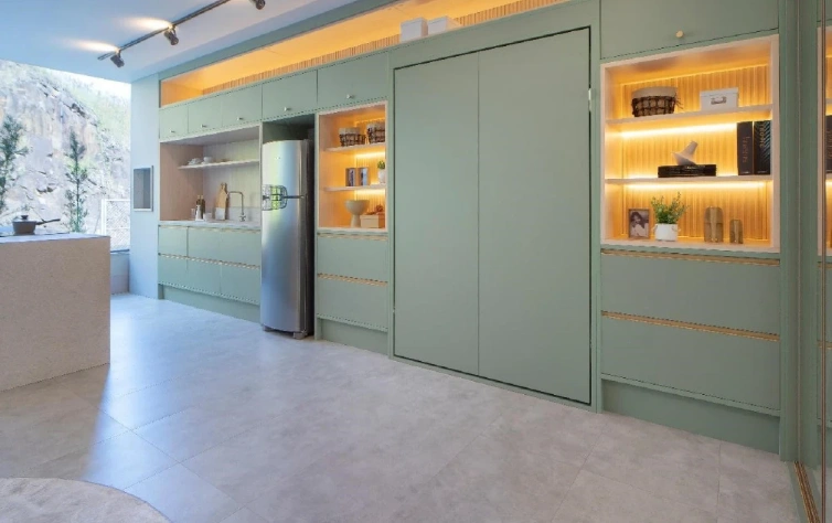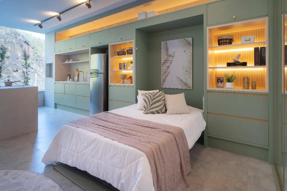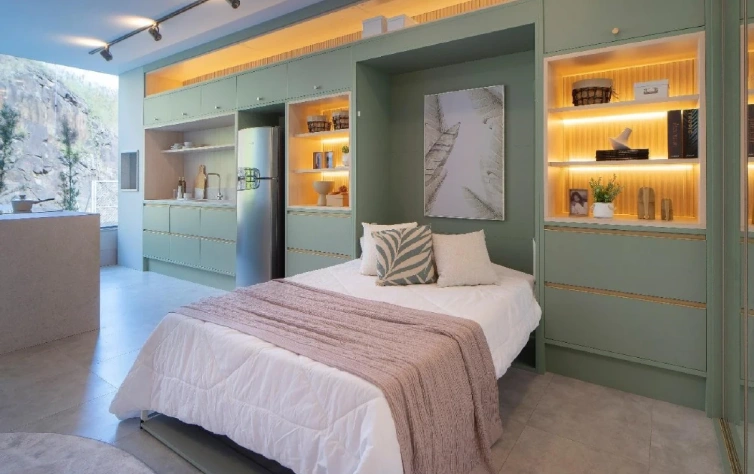 Outra possibilidade é a cama embutida, que pode ser recolhida e virar parede durante o dia.