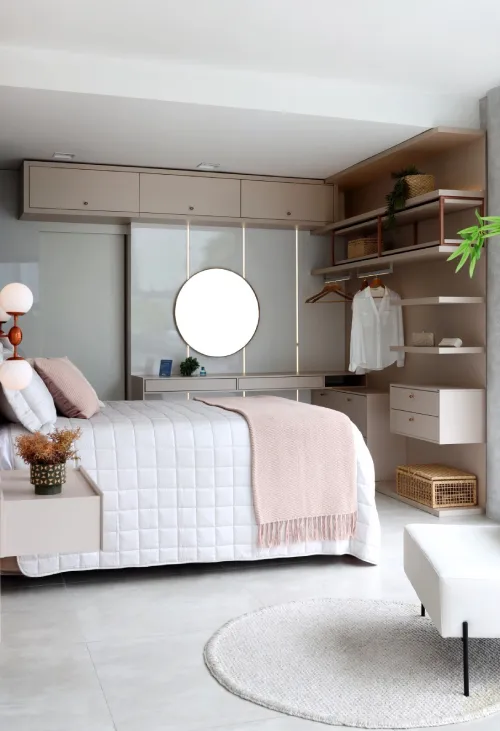 Optar por móveis planejados oferece uma vantagem significativa nesse aspecto. Eles permitem uma integração perfeita das luminárias, garantindo não apenas uma estética fluida e integrada, mas também otimizando o espaço disponível e melhorando a eficiência da iluminação. Essa abordagem não só melhora a funcionalidade do quarto, mas também contribui para uma atmosfera mais agradável e harmoniosa.