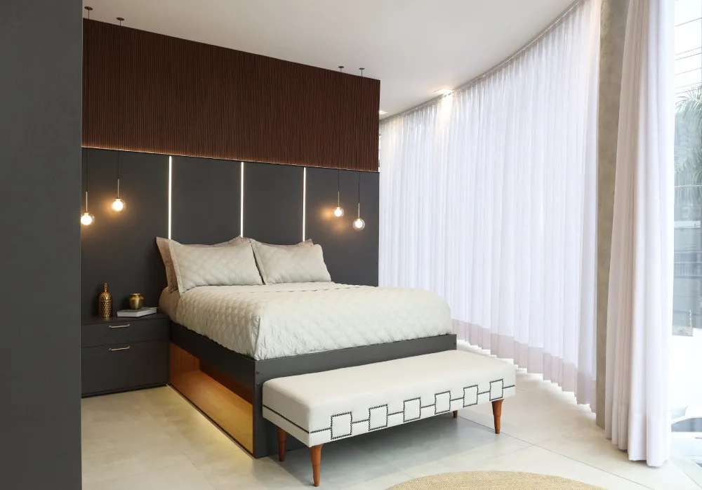 O quarto é um lugar de relaxamento, onde a luz desempenha um papel crucial. Uma iluminação bem planejada não apenas facilita atividades cotidianas, como ler, estudar e se vestir, mas também cria uma atmosfera aconchegante e relaxante para dormir ou descansar.